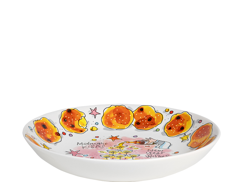 Oliebollen, bubbels en een stapel goede voornemens. Dit diepe bord van 23cm zegt alles wat we hopen voor een nieuw jaar. De illustratie van een bruisende champagnepiramide en de tekst ‘New Year Wishes’ en ‘Midnight Kisses’ maken dit bord ideaal voor oudejaarsavond, of de eerste brunch van het nieuwe jaar. Versierd met vrolijke Blond-illustraties en typisch Nederlandse oliebollen langs de rand, past dit bord perfect in de kerstcollectie van Blond Amsterdam. Combineer het met onze andere kerst- en feestitems voor een tafel vol kleur, knipoog en karakter. Want: geen feestje zonder een beetje Blond.